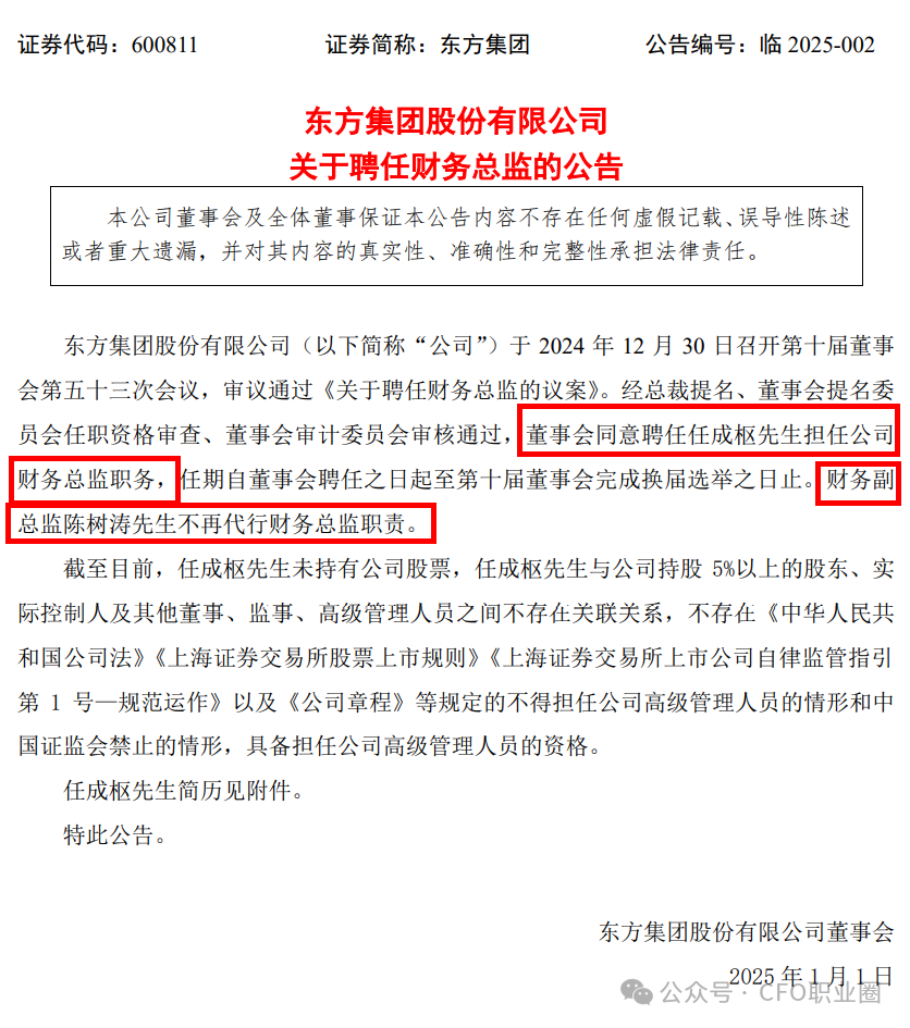 东方集团2025年1月1日发布了《关于聘任财务总监的公告》。公告显示,经总裁提名、董事会提名委员会任职资格审查、董事会审计委员会审核通过,董事会同意聘任任成枢先生担任公司财务总监职务,任期自董事会聘任之日起至第十届董事会完成换届选举之日止。财务副总监陈树涛先生不再代行财务总监职责。