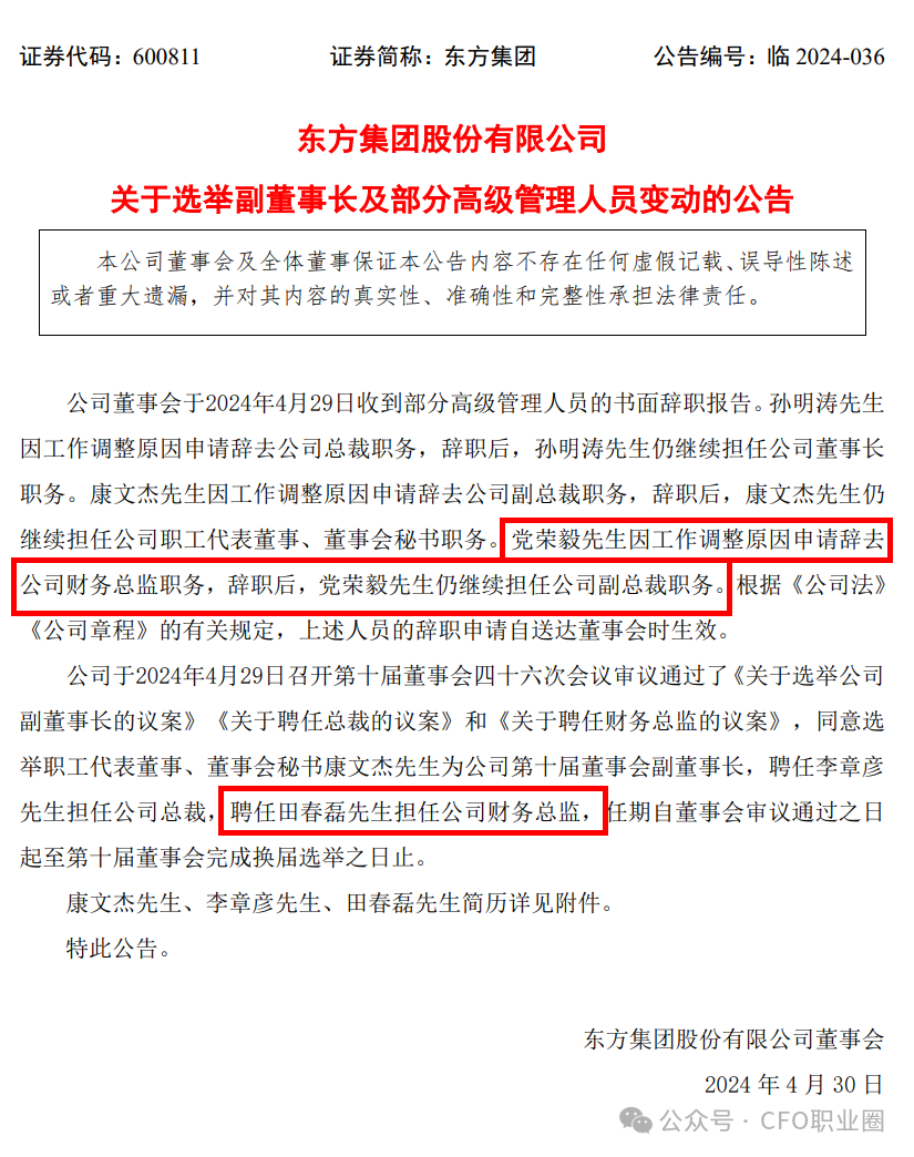 2024年4月30日,东方集团发布了《关于选举副董事长及部分高级管理人员变动的公告》。公告显示,党荣毅先生因工作调整原因申请辞去公司财务总监职务,辞职后,党荣毅先生仍继续担任公司副总裁职务。董事会同意聘任田春磊先生担任公司财务总监。
