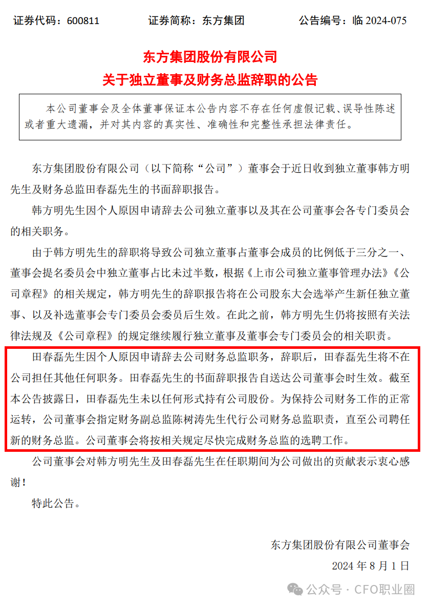 2024年8月1日,东方集团发布了《关于独立董事及财务总监辞职的公告》。公告显示,田春磊先生因个人原因申请辞去公司财务总监职务,辞职后,田春磊先生将不在公司担任其他任何职务。为保持公司财务工作的正常运转,公司董事会指定财务副总监陈树涛先生代行公司财务总监职责,直至公司聘任新的财务总监。公司董事会将按相关规定尽快完成财务总监的选聘工作。