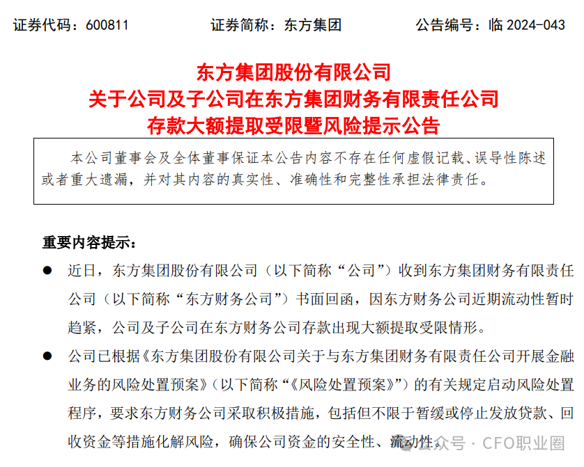 东方集团的“东窗事发”源于2024年6月19日晚的一则公告。公告中东方集团称,“近日,公司收到东方财务公司书面回函,因东方财务公司近期流动性暂时趋紧,公司及子公司在东方财务公司存款出现大额提取受限情形。”截至2024年6月17日,东方集团及子公司在东方财务公司存款余额为16.4亿元、贷款余额为6.66亿元。