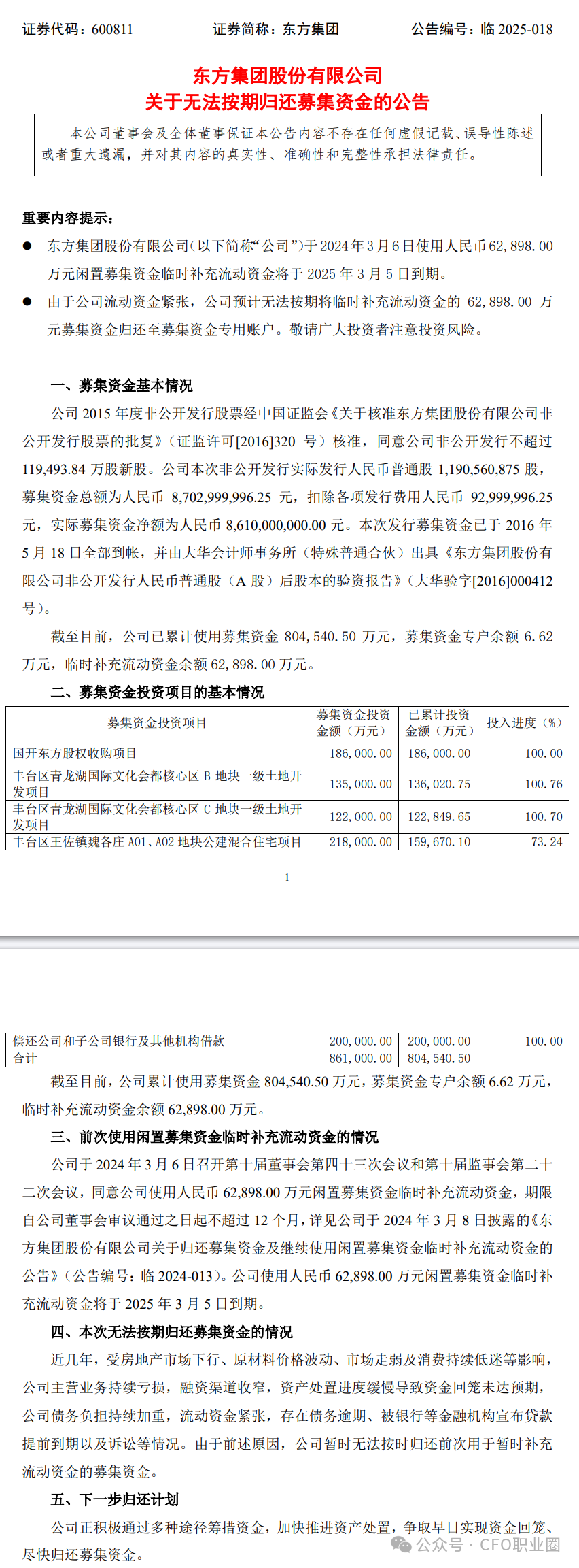 东方集团还于2025年2月14日披露了关于无法按期归还募集资金的公告。公司于2024年3月6日使用6.29亿元闲置募集资金临时补充流动资金,由于公司流动资金紧张,公司预计无法按期将上述募集资金归还至募集资金专用账户。