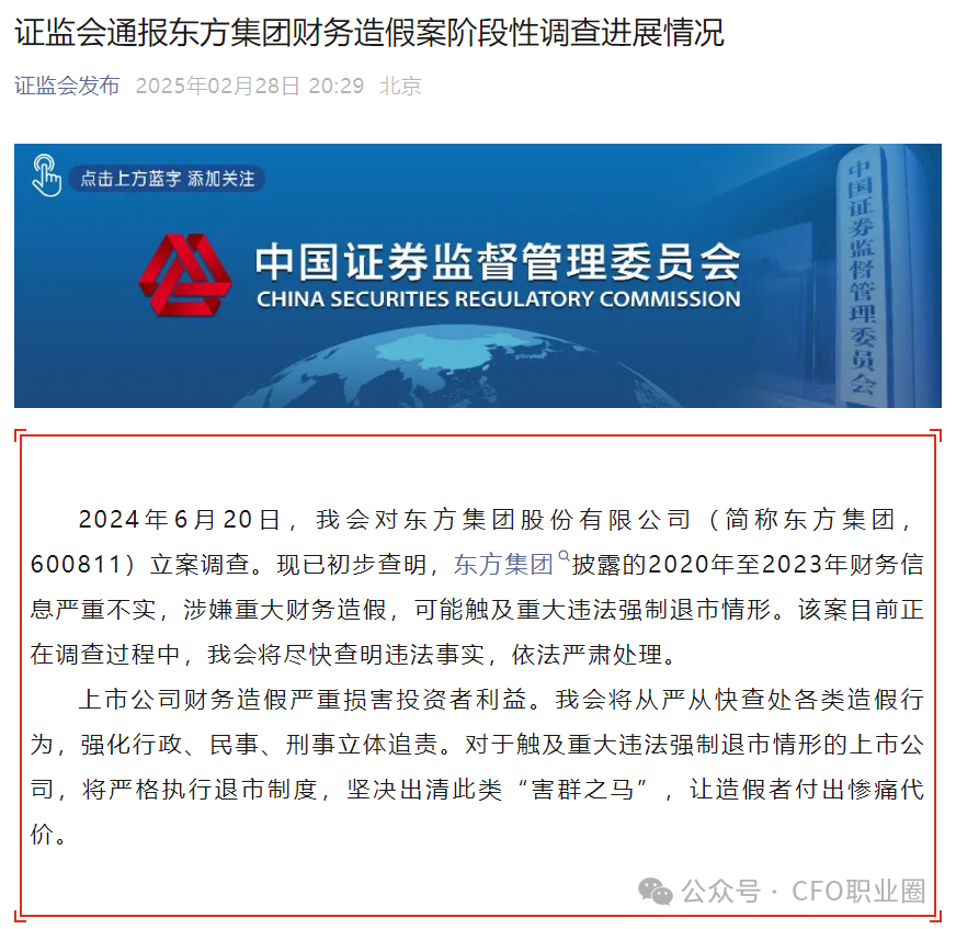2025年2月28日晚,证监会通报东方集团财务造假案阶段性调查进展情况。