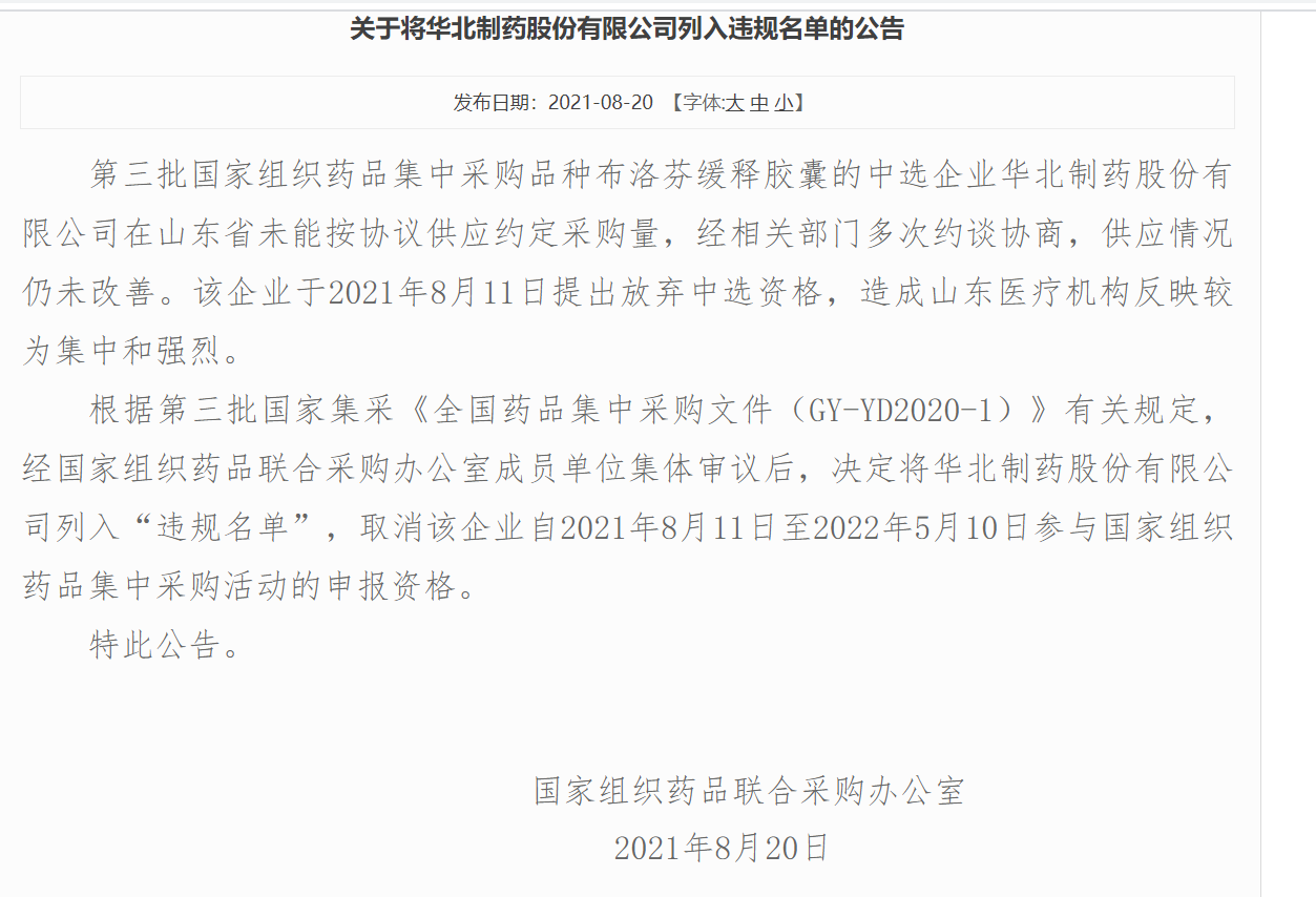 8月20日,国家组织药品联合采购办公室在上海阳光医药采购网发布公告称,决定将第三批国家组织药品集中采购品种布洛芬缓释胶囊的中选企业华北制药股份有限公司(华北制药,600812)列入“违规名单”。