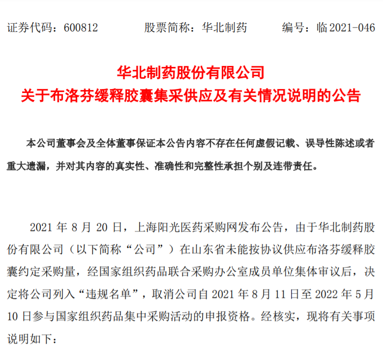 曾被誉为“新中国制药工业的摇篮”、“共和国的医药长子”的华北制药因8月20日上海阳光医药采购网发布的一则“未能按协议供应布洛芬缓释胶囊约定采购量取消下一轮集采申报”公告再次引起行业关注,甚至有多家媒体在周末发文猜测集采断供背后的原因。