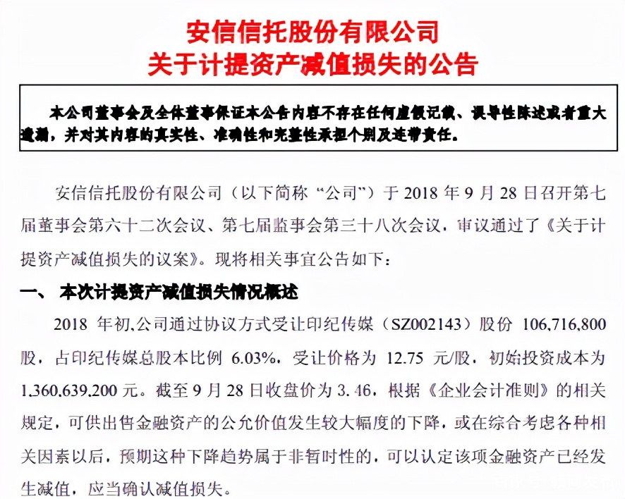 2018年初,安信信托通过协议方式受让印纪传媒股份1.07亿股,占印纪传媒总股本比例6.03%,受让价格为12.75元/股,初始投资成本为13.61亿元。但当年印纪传媒业绩暴雷,在2018年9月安信信托对印纪传媒计提资产减值准备9.91亿元。这也导致归属于上市公司股东的净利润减少约7.44亿元。