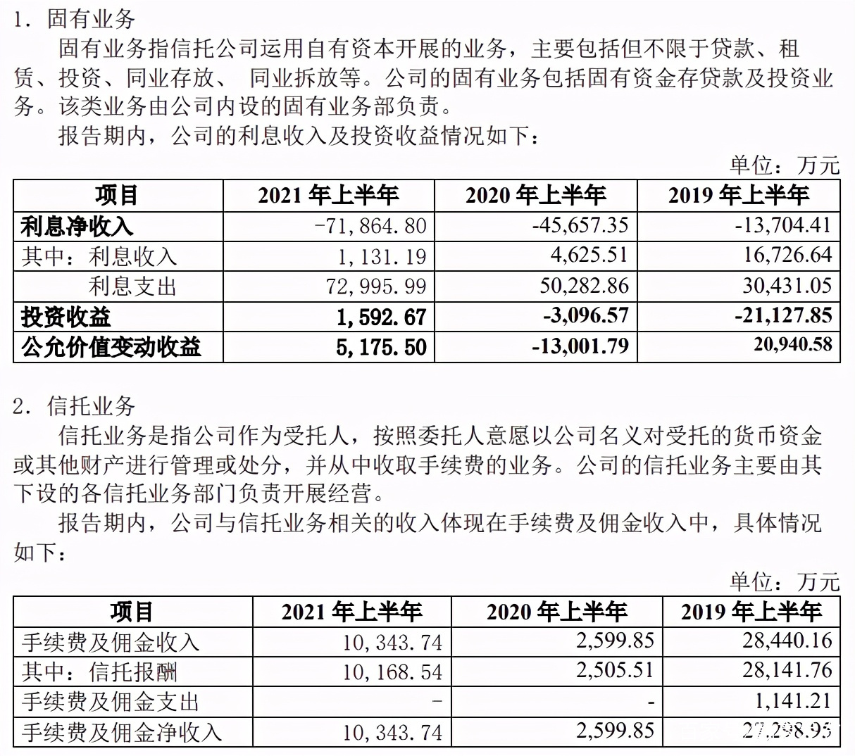 此外,截至今年上半年末该公司主营业务仍处于亏损状态。根据半年报数据显示,今年上半年固有业务利息净收入﹣7.19亿元,去年同期为﹣4.57亿元;今年上半年信托业务手续费及佣金净收入1.03亿元,去年同期0.26亿元。记者致函问询这些变化的原因,截至出稿,未能收到对方回复。