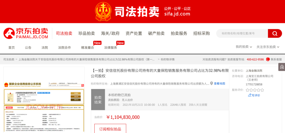 10月21日,京东拍卖网显示,上海金融法院公开拍卖的安信信托(ST安信,600816.SH)持有的大童保险销售服务有限公司32.98%股权一拍结束。此次拍卖已流拍,对应起拍价为11.0483亿元,保证金1亿元,仅1人报名,流拍原因为无人出价。