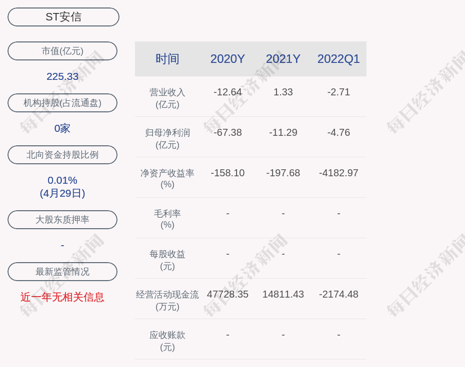 每经AI快讯,ST安信(SH 600816,收盘价:4.12元)发布一季度业绩公告称,2022年第一季度归属于上市公司股东的净利润亏损约4.76亿元。
