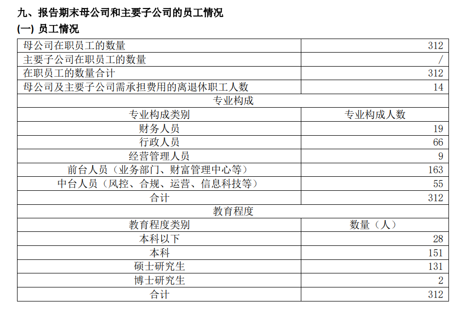 按照专业构成类别,财务人员19人,行政人员66人,经营管理人员9人,前台人员(业务部门、财富管理中心等)163人,中台人员(风控、合规、运营、信息科技等)55人。