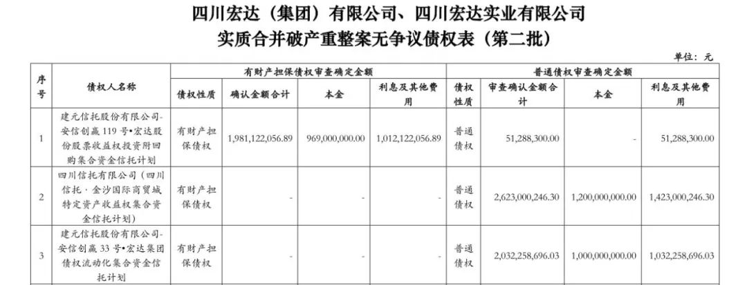 这份《民事裁定书》当中,披露了四川宏达集团、四川宏达实业公司实质合并破产重整案无争议债权表(第二批)名单。
