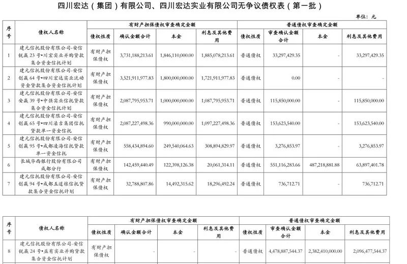 其中,建元信托旗下7款产品申报了12笔债权,其中6笔为有财产担保债权,确定的债权金额合计为120.19亿元;6笔为普通债权,确定的债权金额合计为47.86亿元。长城华西银行成都分行申报了2笔债权,其中1笔为有财产担保债权,确定的债权金额为1.42亿元;1笔为普通债权,确定的债权金额为5.51亿元。中国银行什邡支行申报了1笔债权,是普通债权,确定的债权金额为3.89亿元。中国农业银行成都锦城支行申报了1笔债权,是普通债权,确定的债权金额为2.84亿元。