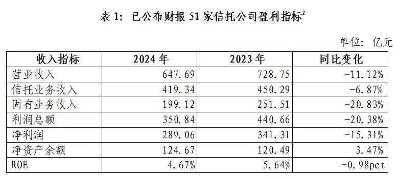 根据2024年财报,51家信托公司营业收入总额为647.69亿元,同比下降11.12%。其中,24家信托公司的营业收入实现增长,占比约47.06%。位居前五位的公司依次为中信信托、江苏信托、英大信托、华鑫信托以及陕国投信托。