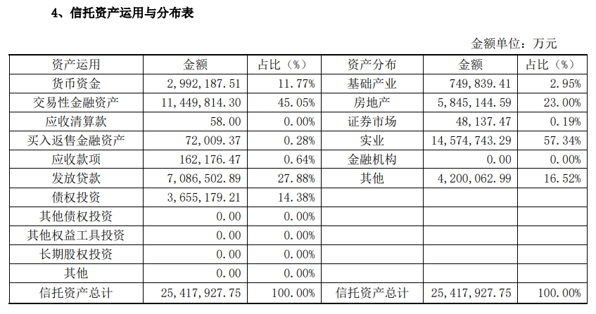 从信托资产分布情况来看,其信托资产中实业占比57.34%,房地产占比23%,其他占比16.52%。此外基础产业、证券市场分别占比2.95%、0.19%。