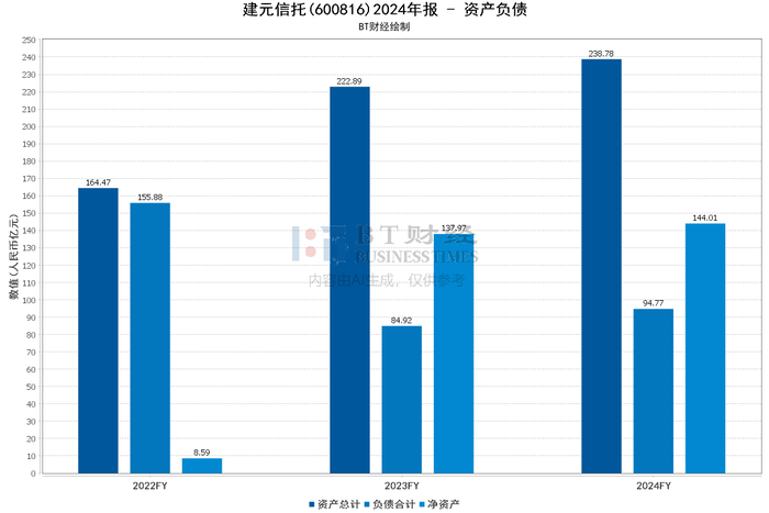2024年,建元信托的资产总计为238.78亿元,较年初增长7.13%。负债总计为94.77亿元,较年初增长11.58%,资产负债率为39.69%,略高于上年的38.1%。这一增长主要得益于公司在新兴业务领域的投入和优质资产的布局。