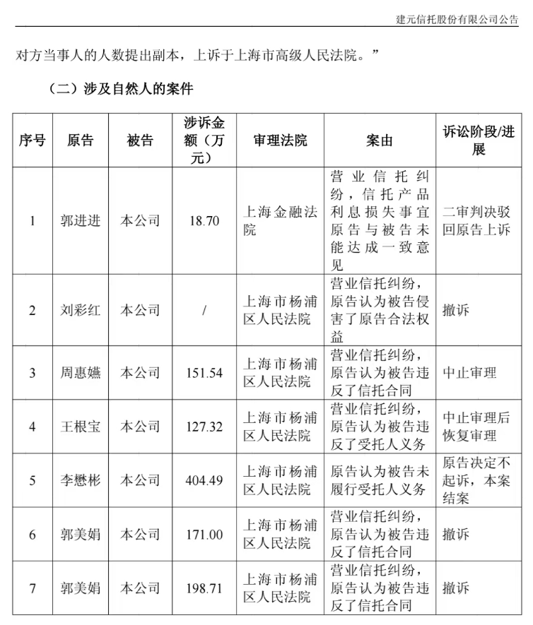 公告显示,目前建元信托涉及的诉讼案件处于不同阶段,其中 1 宗案件一审判决,1 宗案件二审判决,3 宗案件已撤诉,1 宗案件已结案,1 宗案件中止审理,1 宗案件尚在审理中,公司在这些案件中均处于被告地位。
