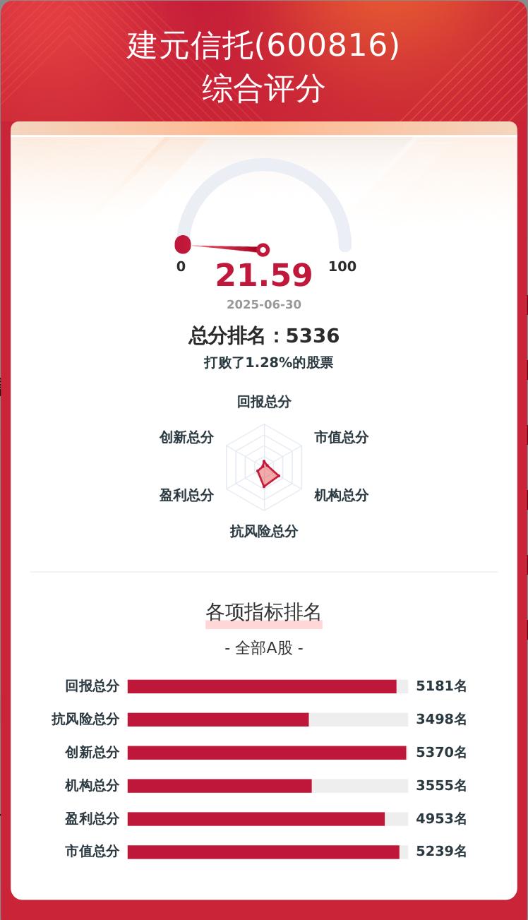 上市公司研究院构建了一套上市公司韧性评价体系,从企业盈利、科技创新、股东回报、经营抗风险、市值表现及机构吸引力六个维度对企业进行量化评分,满分为100分。建元信托的韧性评价总分为21.59分,在A股5405家可比上市公司中排名第5336位。