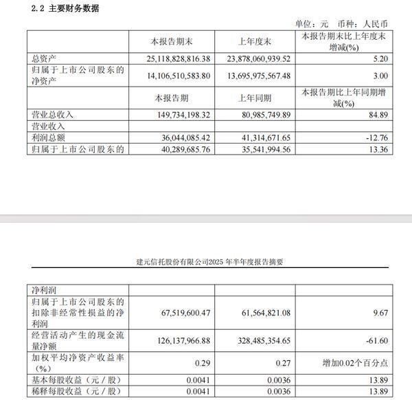 今日,建元信托(证券代码:600816.SH)发布2025年半年度报告披露,公司上半年实现营业总收入1.50亿元,同比增长84.89%,实现归母净利润0.40亿元,同比增长13.36%;截至2025年6月末,公司归母净资产141.07亿元,同比增长3.00%。公司整体规模稳步扩张,经营质效不断提升。