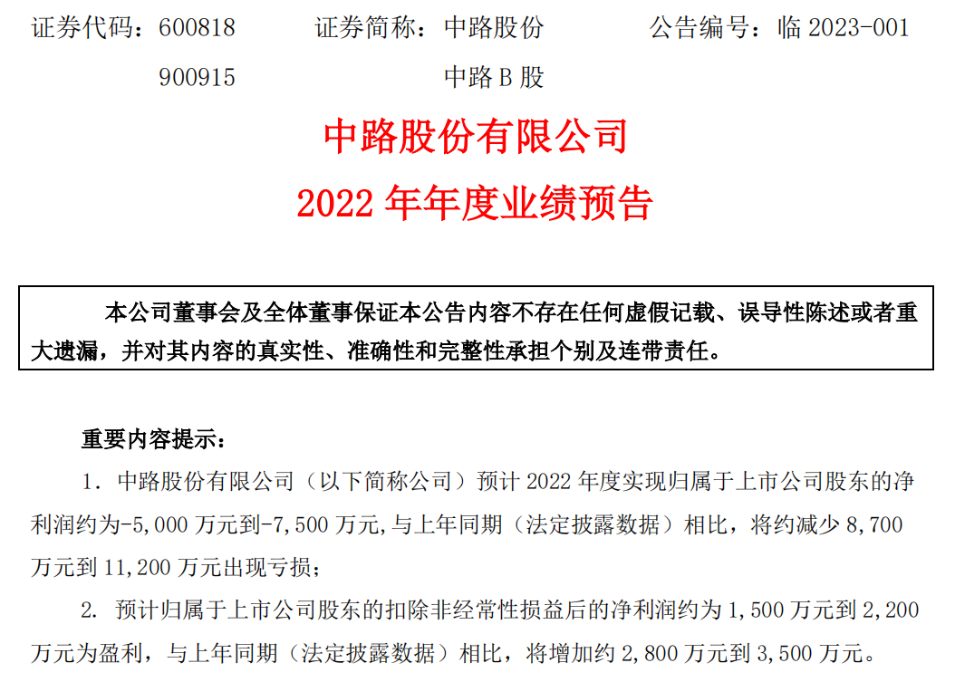 1月16日盘后,拥有知名的“永久”自行车品牌的中路股份(600818.SH)披露了2022年年度业绩预告。