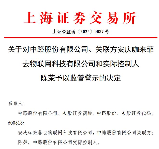 鉴于上述违规事实和情节,根据有关规定,上交所上市公司管理二部决定对中路股份、关联方安庆咖来菲去、实际控制人陈荣予以监管警示。