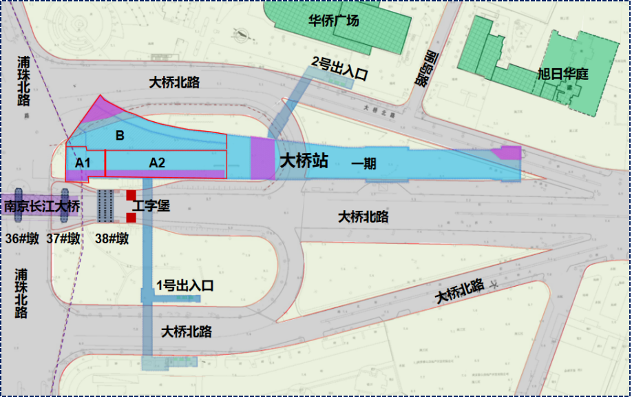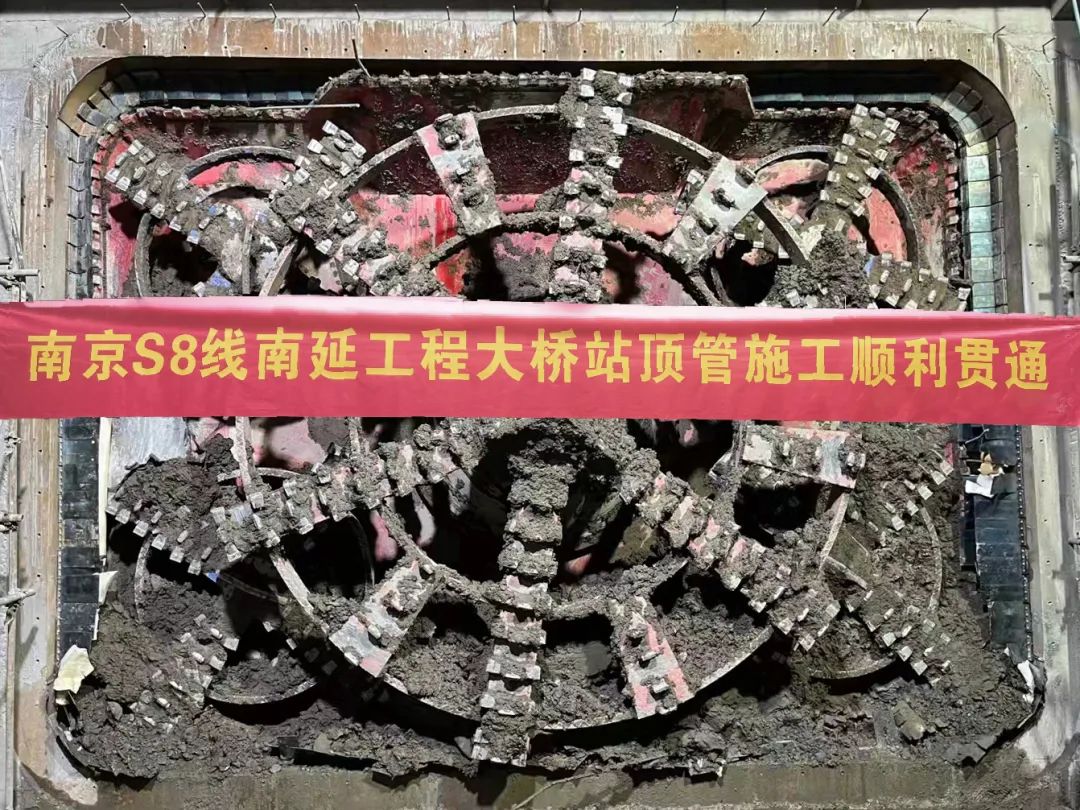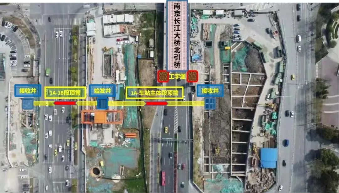大桥站位于江北新区大桥北路与江山路交叉口处,1号出入口过街通道横穿大桥北路快速路、大桥北路辅路及众多重要市政管线,交通任务繁忙,周边环境复杂,不具备明挖条件,因此项经部采用由一台6.9米×4.9米超大断面土压平衡矩形顶管机从逗号广场东侧工作井分别向两侧推进。