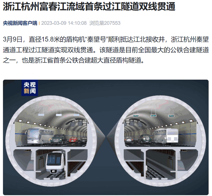 同一时间,由隧道股份上海隧道参与投资承建的杭州秦望通道工程“秦望号”超大直径盾构顺利接收,实现双线隧道贯通。