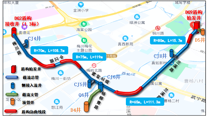 桃浦污水处理厂雨水调蓄工程TP1.4标涉及桃浦污水厂初期雨水调蓄工程中连接真如、曹杨、铜川三个排水系统的厂外管道工程。工程主体包括6个盾构井、2个顶管井、盾构隧道(DN4000),顶管隧道(DN2000~DN2400),以及3座骑马井,其中盾构隧道总长3254.2米。