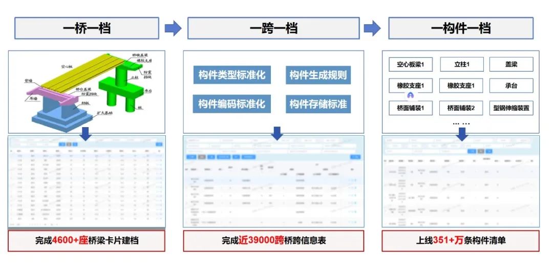 另一方面,在标准化的基础上,隧道股份城市运营完成了所辖所有桥梁的一桥一档、一跨一档、一构件一档的建档工作。每一座桥梁都有属于自己的“病历卡”,总计生成了350余万份桥梁“健康档案”,每一份档案都包括构件名称、构件编码、桥梁名称等静态信息、历史病害、评价以及维修信息,为设施的全生命周期数字化运维提供数据支撑。