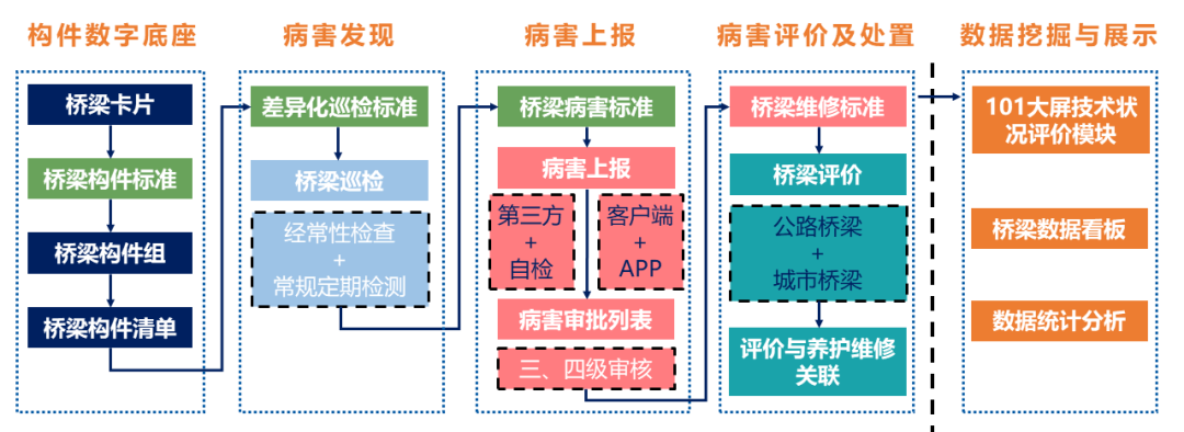 近年来,隧道股份城市运营探索建立面向城市安全的数字化检测服务模式,加强交通基础设施监测预警,推动公共安全管理模式进一步向“事前预防”转型。其中,在桥梁结构安全方面,隧道股份城市运营目前已完成桥梁数字化运维场景开发,实现了所辖4600多座桥梁共351余万个构件的数字底座建设,形成了桥梁病害发现、上报、评价和维修销项的数字化闭环管理。