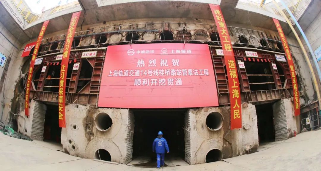 国内首例软土地层管幕法车站。在桂桥路站建设中,隧道股份上海隧道结合项目特点及重大风险,历经5次前期实验、7次工艺验证,“管幕暗挖”工法横空出世,取得了2大市级工法、9项专利的丰硕成果,得到了中国工程院陈湘生院士的高度评价。它在饱和软土地区首次运用,相当于摸着石头过河,吹响了非开挖体系建立的号角。