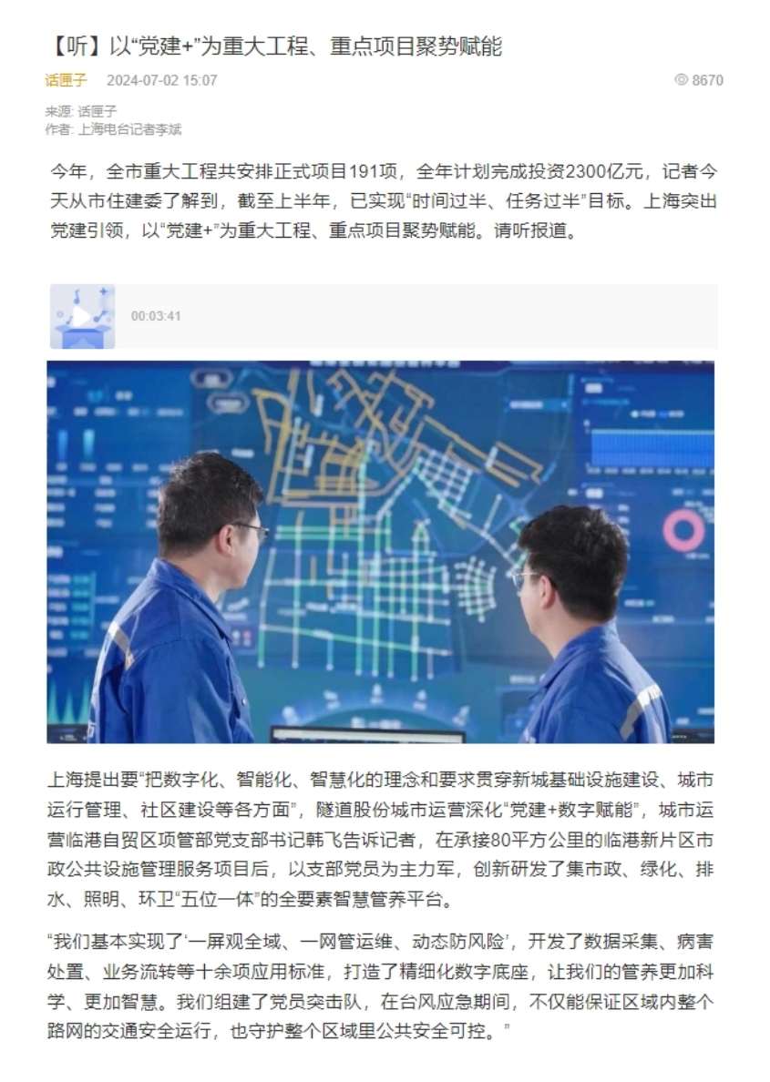 数字化转型是上海城市交通高质量运行的基石,如何让数字化产业持续跑出“发展加速度”,实现久久为功、数智常新?对此,隧道股份城市运营探索“党建+数字”双肩挑新模式,以“党建创新”赋能“智慧运营”新图景。