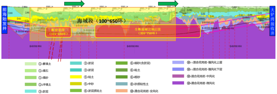 盾构机掘进过程中需穿越软硬不均硬岩地层,海域段施工期间盾构掘进穿越两次海域断裂带,下穿大铲湾北岸大堤以及大铲湾码头沉箱结构。进入接收陆域段后,隧道穿越妈湾跨海通道工程2标施工场地,施工环境极为复杂。