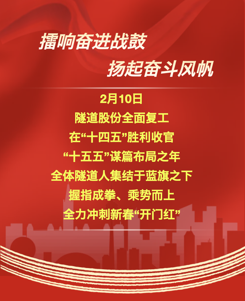 春节假期后,隧道股份各业务板块迅速投入生产建设,在重大工程、市场经营、运维管理等领域捷报频传,擂响奋进战鼓,扬起奋斗风帆,以“起步即冲刺”的姿态为新一轮改革发展注入强劲动能。