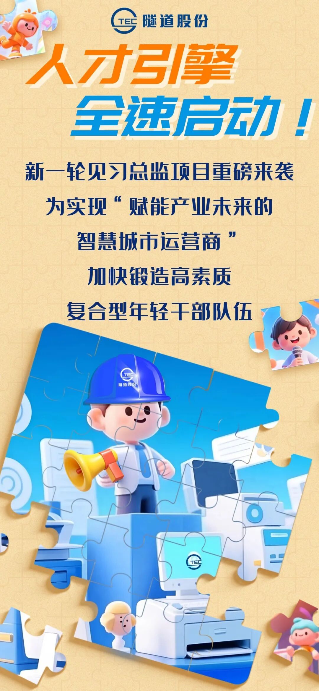 一直以来, 隧道股份 都是“战略导向型”的企业,从“十二五”的工程总承包商到“十三五”的综合服务商,再到“十四五”的资源集成商,我们始终围绕目标愿景、保持战略定力,开展了一系列改革转型。当前, 隧道股份 的行业地位与社会认可度已迈上新高。但行业发展的外部环境正发生深刻变革,行业正从“粗放增量”模式转向“存量+增量”并重的新阶段,集团“十五五”战略正是引领企业穿越周期、开创未来的行动纲领。青年人才必须深刻领会“十五五”战略内涵,围绕“赋能产业未来的智慧城市运营商”目标愿景,立足跨界岗位锻炼,提升科创思维与产业思维,加强产业协同能力;要珍惜并立足 隧道股份 的场景与平台资源,依托“项目+服务”“项目+产业”,在“干好活”之外,积极聚焦城市更新、数字转型、绿色低碳等领域,挖掘新的发展空间与未来产业价值。