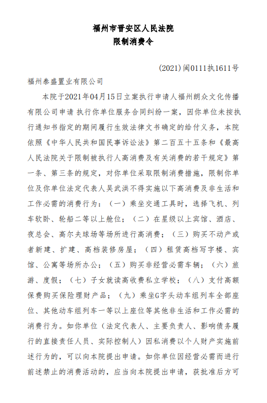 福州市晋安区人民法院依照《中华人民共和国民事诉讼法》第二百五十五条和《最高人民法院关于限制被执行人高消费及有关消费的若干规定》第一条、第三条的规定,对福州泰盛置业采取限制消费措施,限制福州泰盛置业及福州泰盛置业法定代表人吴武洪不得实施以下高消费及非生活和工作必需的消费行为: