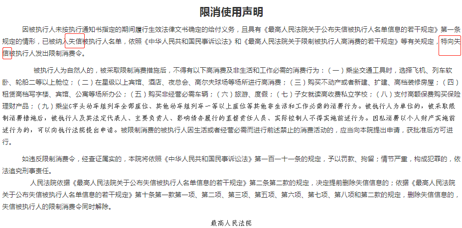 据中国经济网记者了解,因被执行人未按执行通知书指定的期间履行生效法律文书确定的给付义务,且具有《最高人民法院关于公布失信被执行人名单信息的若干规定》第一条规定的情形,已被纳入失信被执行人名单,依照《中华人民共和国民事诉讼法》和《最高人民法院关于限制被执行人高消费的若干规定》等有关规定,特向失信被执行人发出限制消费令。