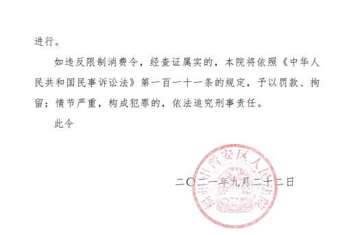 福州市晋安区人民法院上述限制消费令签发时间为2021年9月22日。