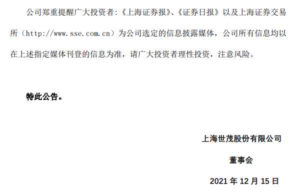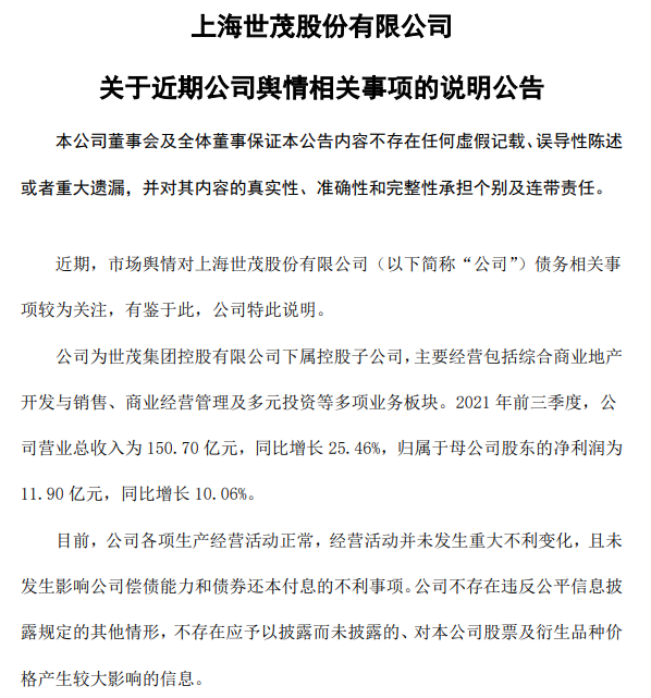 12月14日晚间,世茂股份就近期公司舆情相关事项发布说明:公司为世茂集团控股有限公司下属控股子公司。目前,公司各项生产经营活动正常,经营活动并未发生重大不利变化,且未发生影响公司偿债能力和债券还本付息的不利事项。