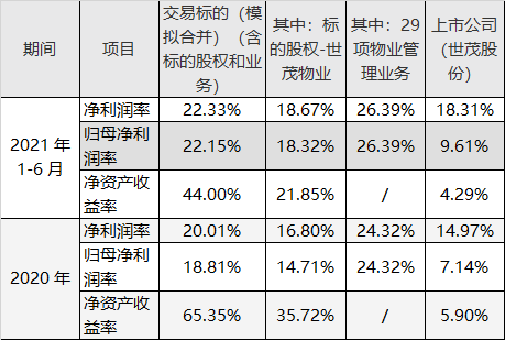 世茂股份此前的公告披露了交易标之一世茂物业2020年、2021年上半年的归母净利润率分别为16.8%、 18.7%,而上市公司分别为7.1%、9.6%;世茂物业2020年净资产收益率为47.0%,而上市公司为5.9%。