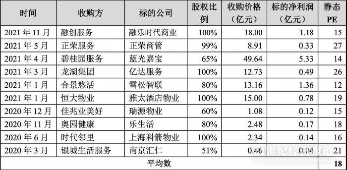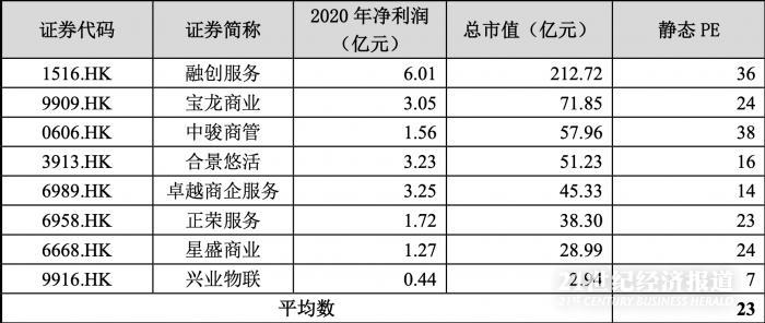 世茂股份披露,同行业上市公司的PE水平在23左右。相比之下,做物管轻资产并购的上市公司静态PE平均水平要低一些。世茂股份将融创服务与正荣服务加入同类型交易做对比,可能只是想借此抬升交易标的的估值水平,或者说证实交易对价是公允的。