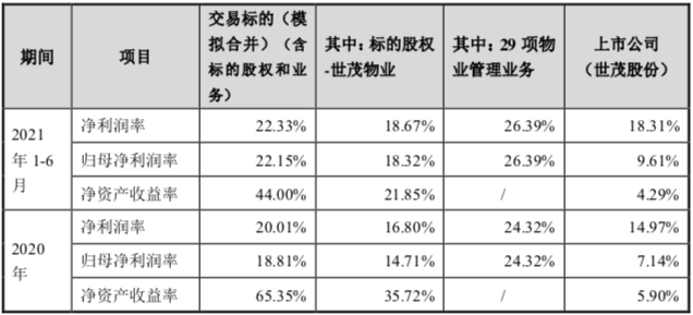 在回复中,世茂股份披露了交易标的与上市公司自身的盈利能力,解释称交易标的的净利润率、净资产收益率高于上市公司,主要为两者所处业态不同,前者为商业地产物业管理服务,后者为商业地产开发销售及运营。