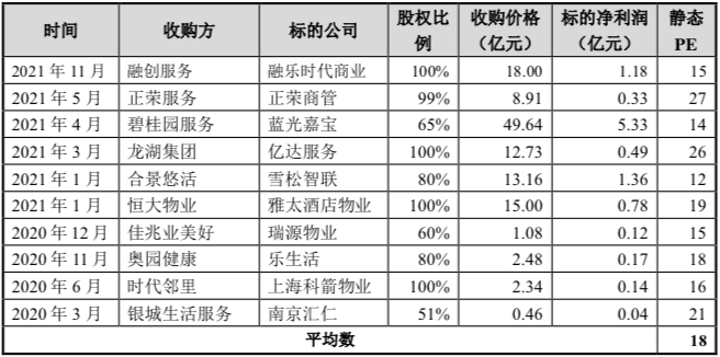 本次世茂股份计划进行的交易中,标的资产作价16.54亿元,其2020年模拟合并净利润为 9124.41万元,静态PE为18.12倍,与近期市场中同行业物业管理资产收购的可比交易均值相近。