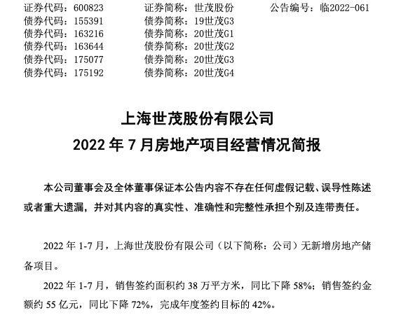 世茂股份8月4日公告,1-7月,公司无新增房地产储备项目。 1-7月,销售签约面积约38万平方米,同比下降58%;销售签约金额约55亿元,同比下降72%,完成年度签约目标的42%。