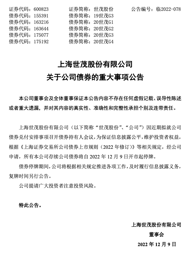 不过,相关市场消息有迹可循。早在12月9日,世茂股份就发布公告称,近期拟就公司债券兑付安排事项召开债券持有人会议,公司存续公司债券自2022年12月9日开市起停牌。目前,该公司旗下存续公司债券均处于停牌状态。