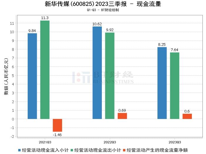 在现金流量方面,新华传媒2023年三季度经营活动产生的现金流量净额为6023.75万元,相比上年同期的6944.72万元有所下滑。经营活动现金流入小计为8.25亿元,相比上年同期的10.62亿元有所下降。经营活动现金流出小计为7.64亿元,相比上年同期的9.92亿元有所下降。这表明公司的现金流量状况总体上保持稳定,但经营活动产生的现金流量净额有所下滑。