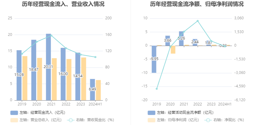 2024年上半年,公司营业收入现金比为105.43%,净现比为-78.27%。