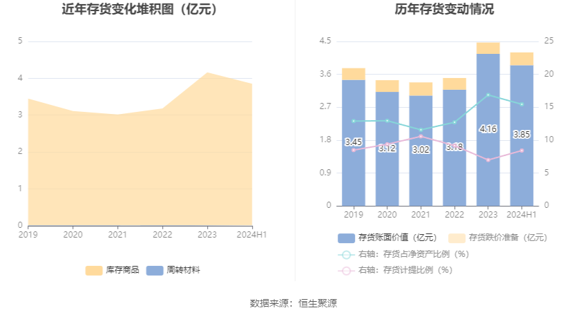 从存货变动来看,截至2024年上半年末,公司存货账面价值为3.85亿元,占净资产的15.45%,较上年末减少3092.87万元。其中,存货跌价准备为3539.49万元,计提比例为8.42%。
