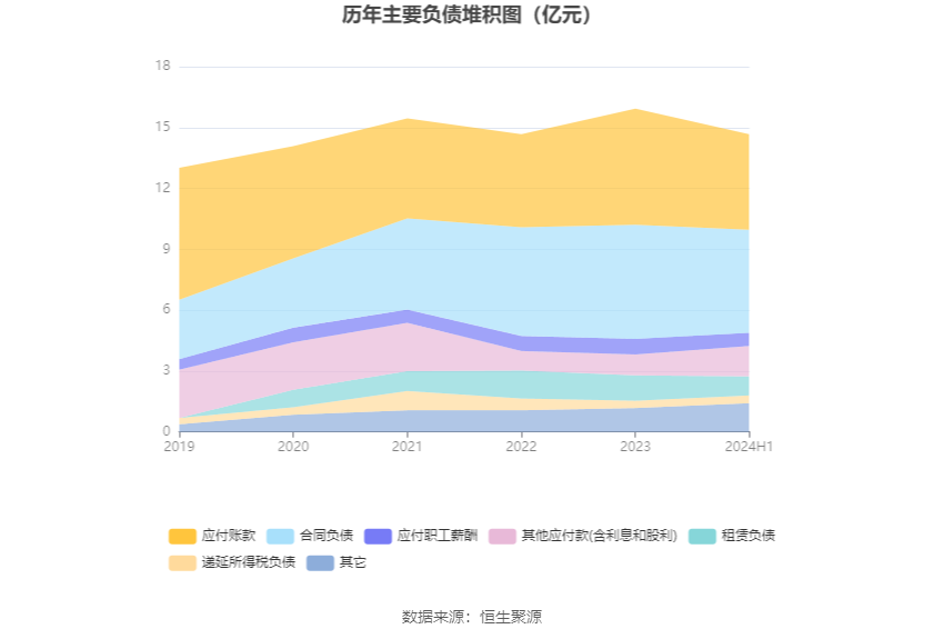 负债重大变化方面,截至2024年上半年末,公司应付账款较上年末减少17.53%,占公司总资产比重下降2.17个百分点;合同负债较上年末减少9.82%,占公司总资产比重下降1.04个百分点;其他应付款(含利息和股利)较上年末增加45.26%,占公司总资产比重上升1.25个百分点;租赁负债较上年末减少24.36%,占公司总资产比重下降0.69个百分点。
