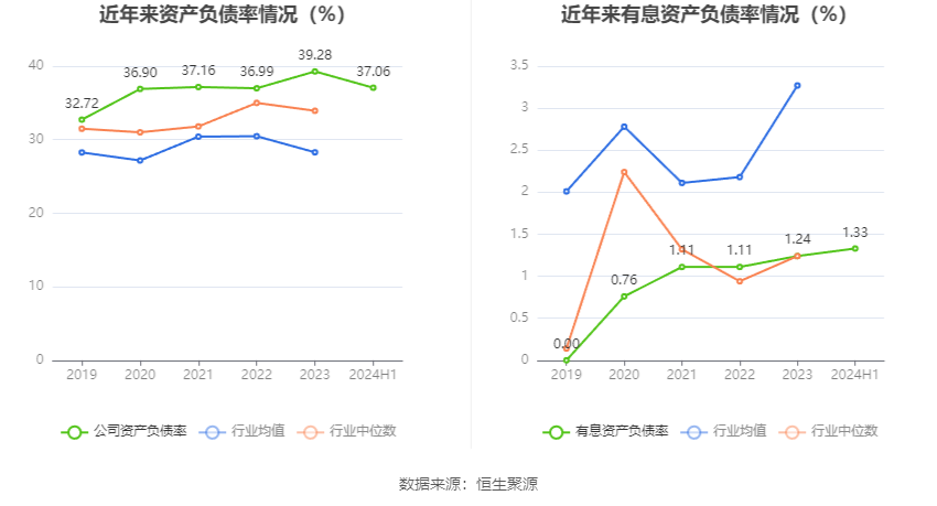 在偿债能力方面,公司2024年上半年末资产负债率为37.06%,相比上年末下降2.22个百分点;有息资产负债率为1.33%,相比上年末上升0.09个百分点。
