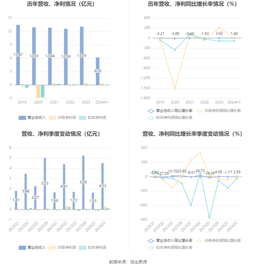 根据半年报,公司第二季度实现营业总收入4.53亿元,同比增长2.59%,环比增长177.96%;归母净利润2803.45万元,同比下降6.95%,环比增长1693.93%;扣非净利润1524.94万元,同比下降37.71%,环比增长222.14%。