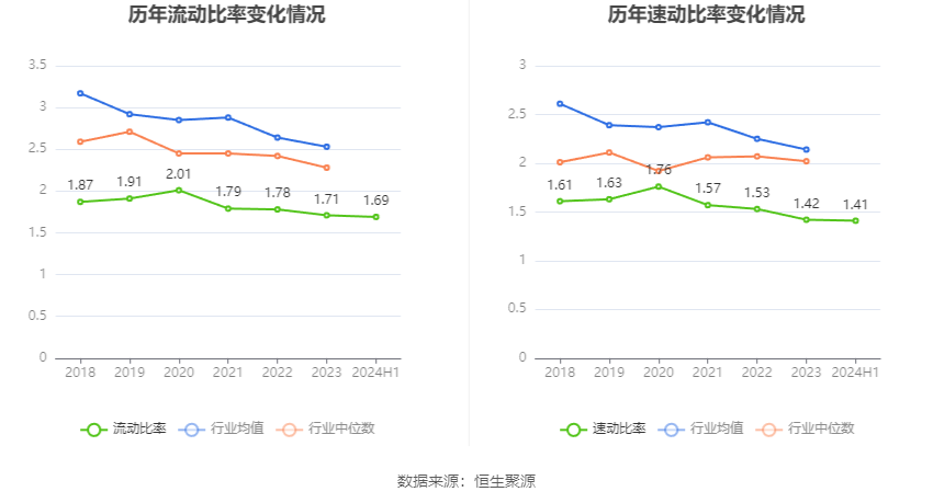2024年上半年,公司流动比率为1.69,速动比率为1.41。